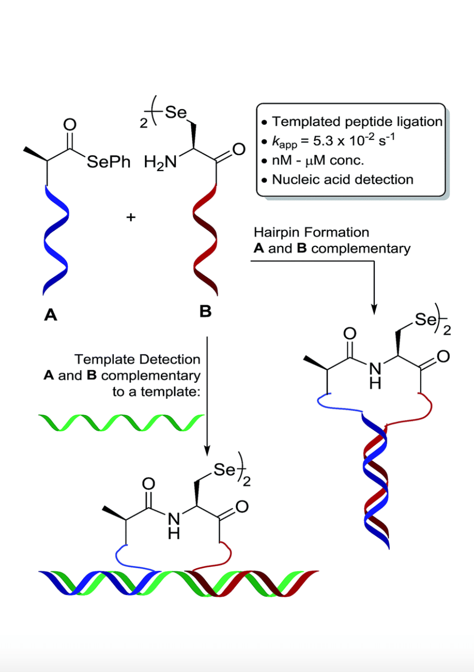 The development of a rapid and chemoselective selenocystine–selenoester peptide ligation that operates at nanomolar reactant concentrations has been developed by utilising PNA templation. Kinetic analysis of the templated peptide ligation revealed that the selenocystine–selenoester reaction was 10 times faster than traditional native chemical ligation at cysteine and to our knowledge is the fastest templated ligation reaction reported to date. The efficiency and operational simplicity of this technology is highlighted through the formation of hairpin molecular architectures and in a novel paper-based lateral flow assay for the rapid and sequence specific detection of oligonucleotides, including miRNA in cell lysates.